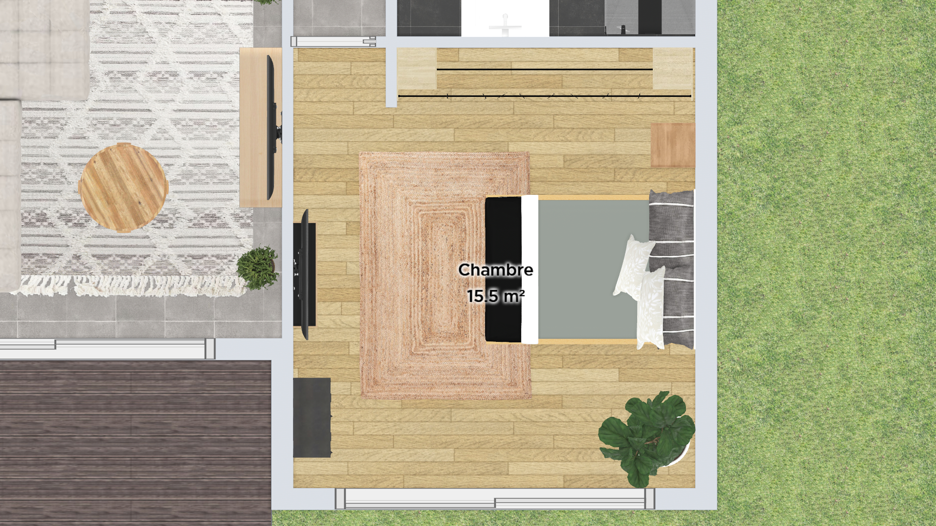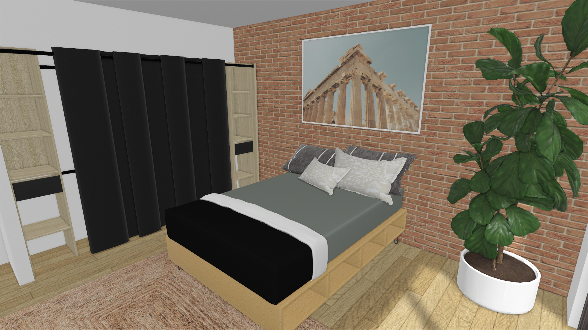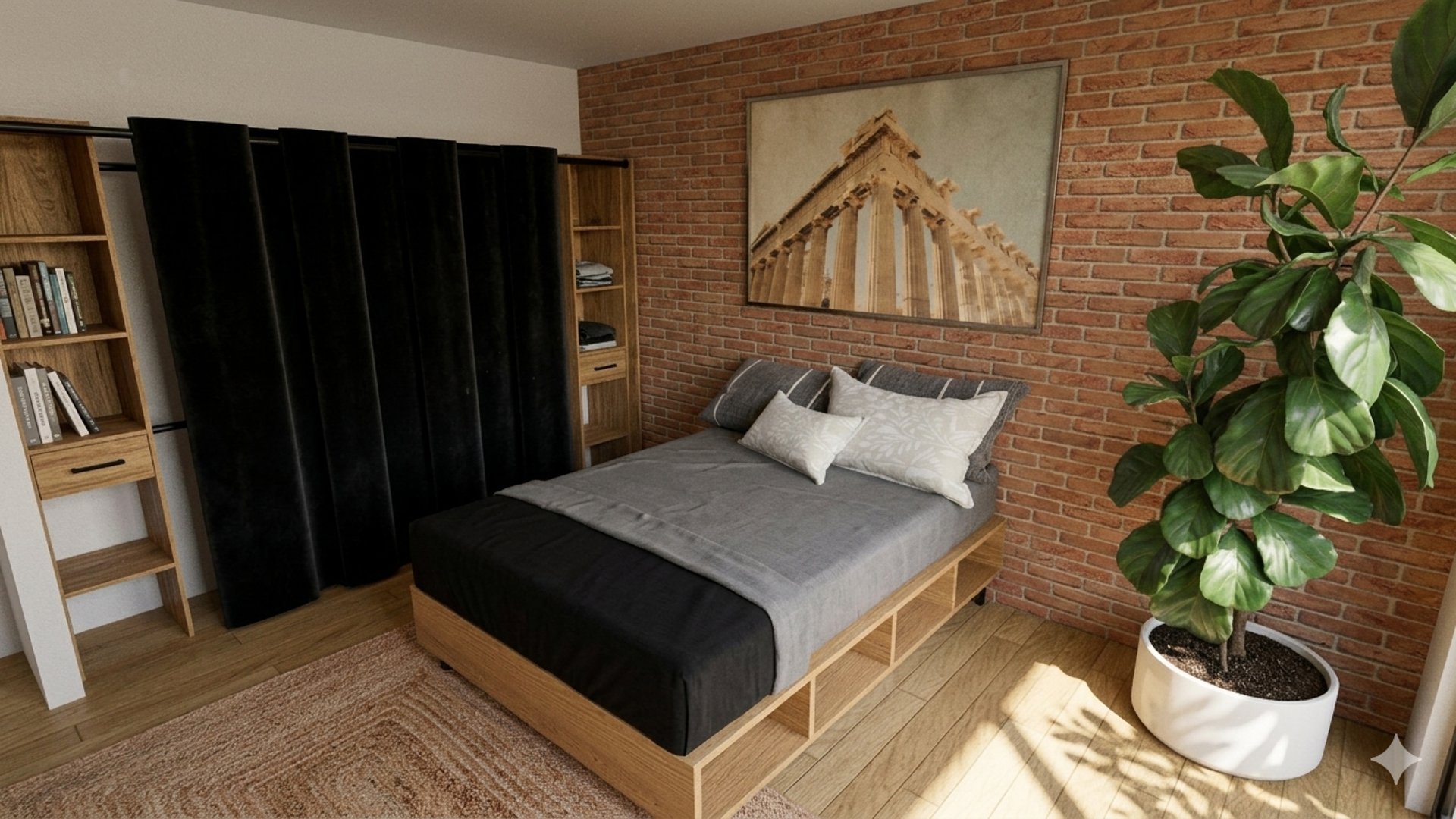 La présence sculpturale d'un grand figuier lyre vient ponctuer ce décor de notes organiques, tandis que les textiles sombres et le rideau en velours noir structurent l'espace avec élégance. Entre la chaleur du bois naturel et la rigueur de la brique, cette chambre devient un sanctuaire où chaque détail célèbre la rencontre des époques.