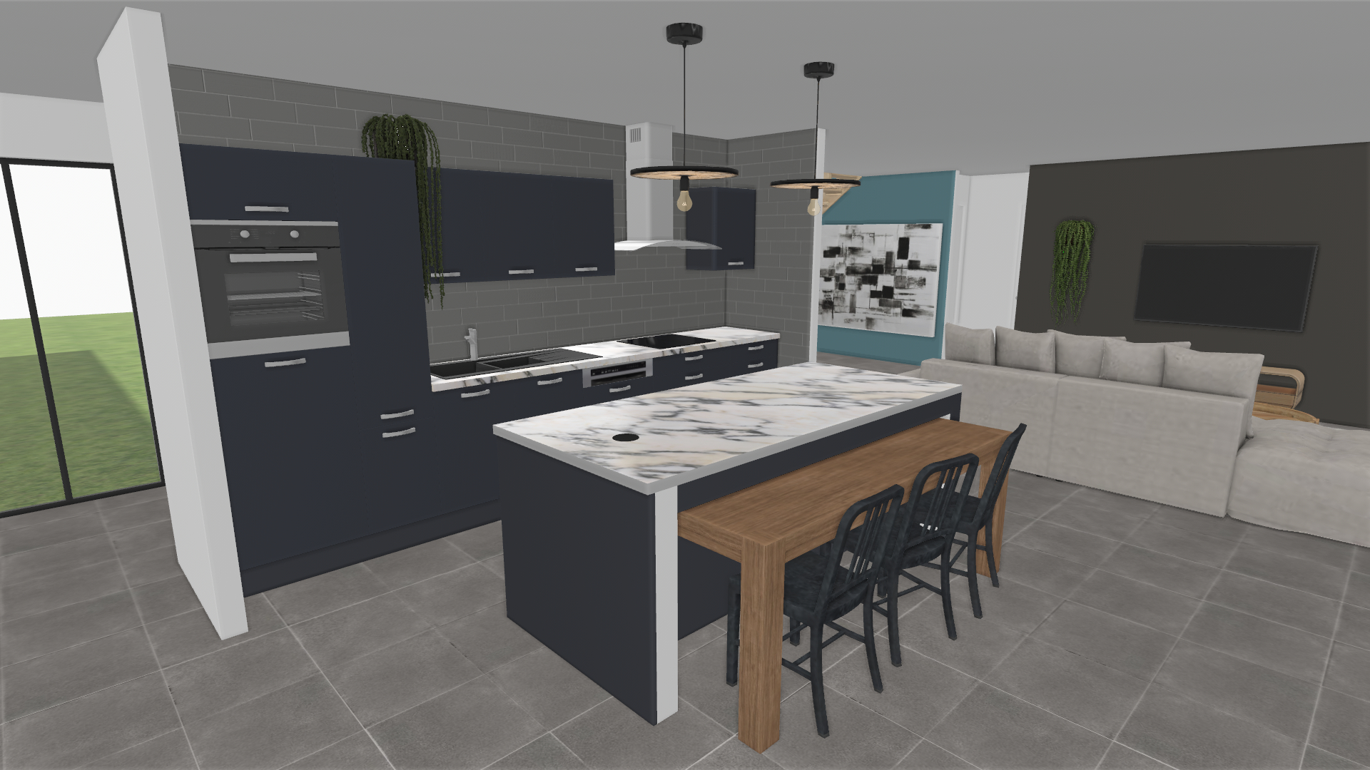 Les façades en graphite mat, d'une sobriété absolue, dissimulent un électroménager de pointe pour préserver la pureté des lignes. Le choix d'une crédence en carrelage texturé et de luminaires suspendus à filament apporte une touche industrielle chic, parfaitement équilibrée par la lumière naturelle qui baigne l'espace.
