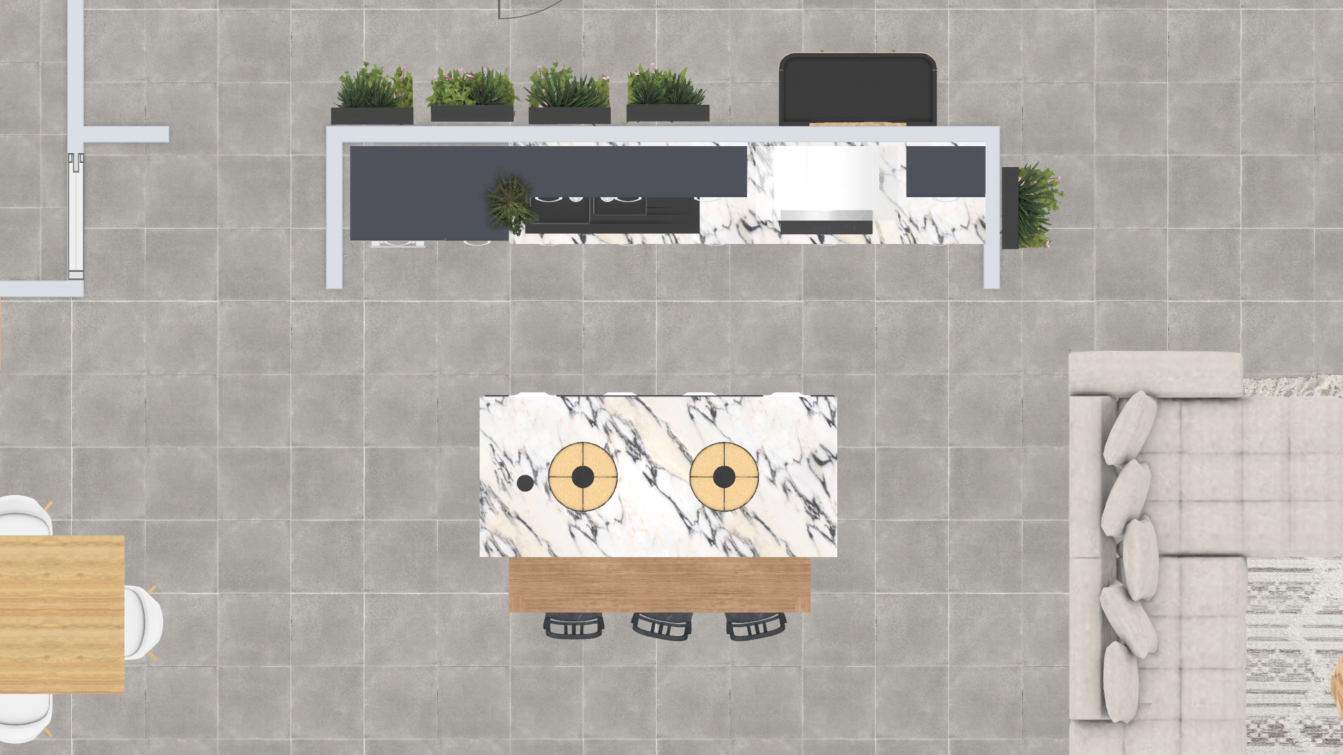 L'élément phare, un îlot habillé d'un marbre blanc aux veinages gris profonds, s'impose par sa prestance minérale. Pour rompre avec la froideur de la pierre, une table de repas en bois massif vient s'y encastrer, créant un pont visuel entre l'espace de préparation et la zone de convivialité.