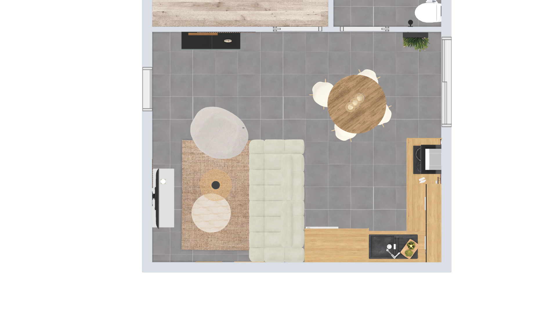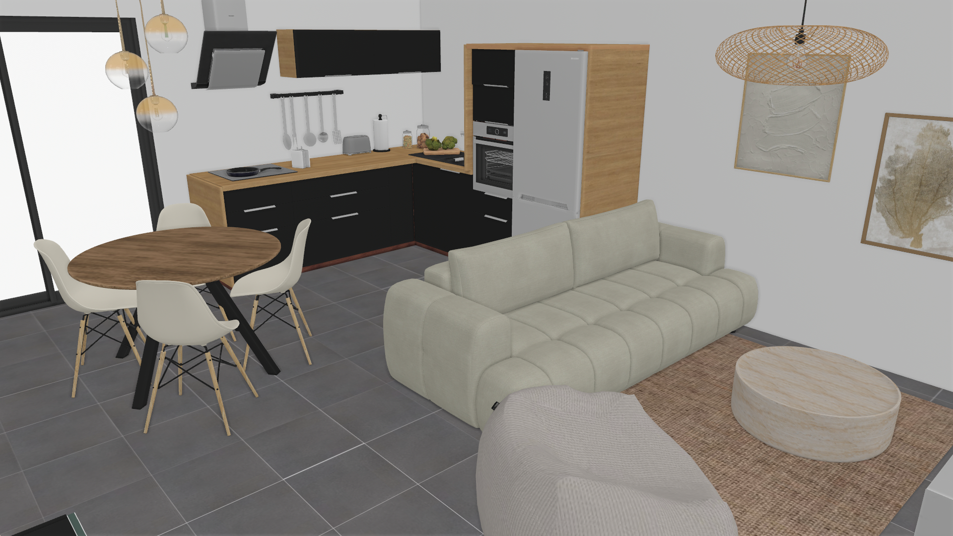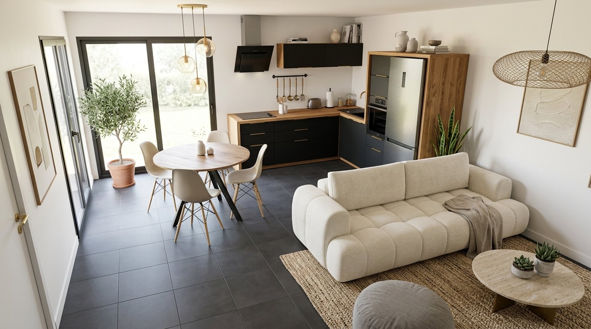 Ce projet Modern Organic allie l'élégance d'une cuisine noire et bois à la douceur d'un salon aux tons crème. Le contraste des matériaux et les touches de verdure créent une atmosphère sereine, lumineuse et naturelle. C'est un intérieur contemporain parfaitement équilibré, pensé pour le confort et le style.